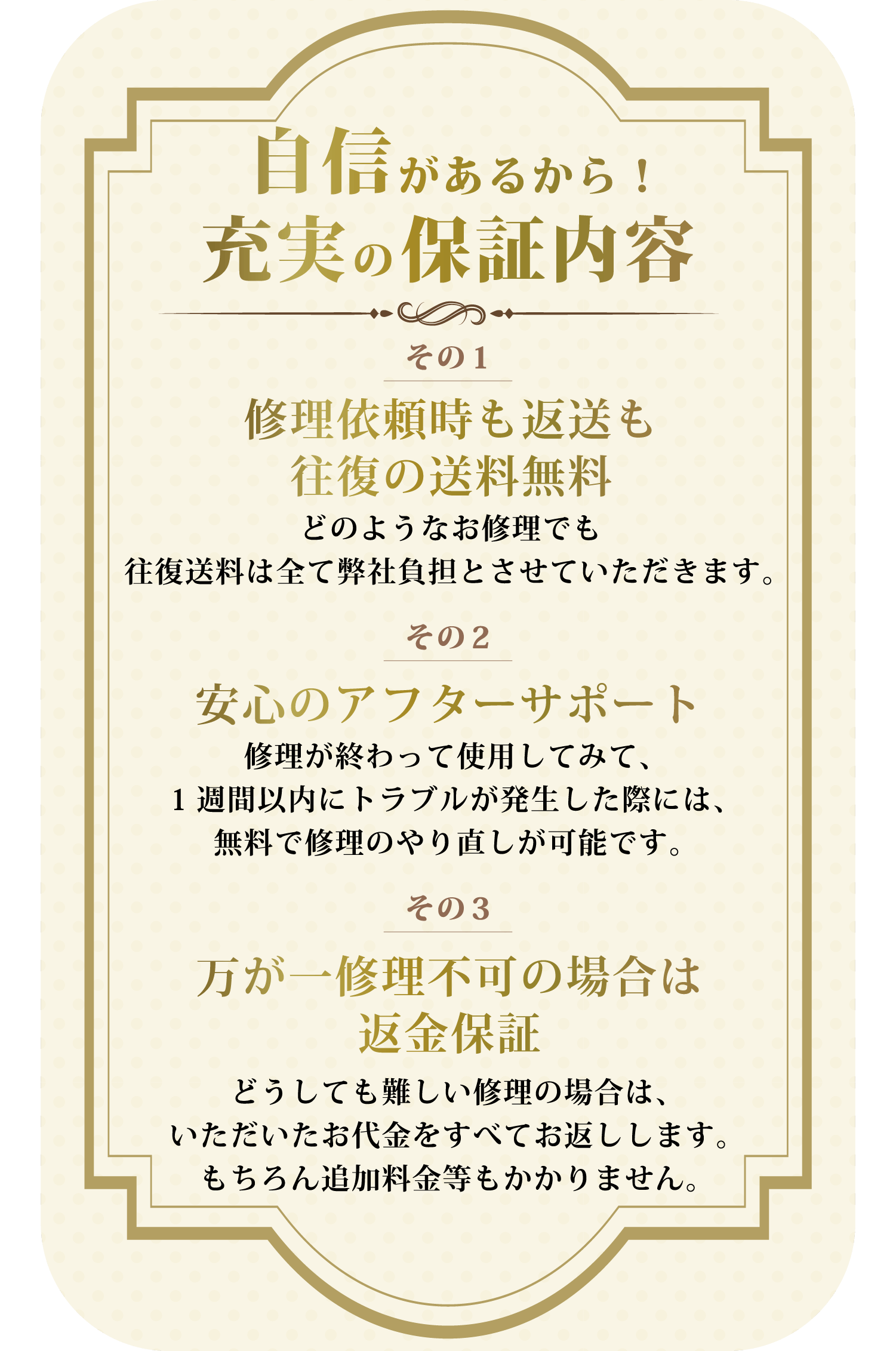 お客様の元へお品物が到着した当日から1週間以内にご連絡をいただけましたら、気になる箇所や不具合を無償で再リペアさせていただきます。